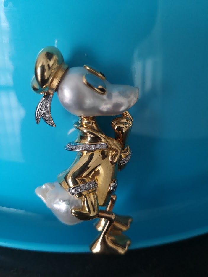 Realizado en oro blanco y amarillo de 18 quilates. Perla australiana y diamantes talla brillante. Esmalte vitrico. Elaboración artesanal y acabado a mano.
