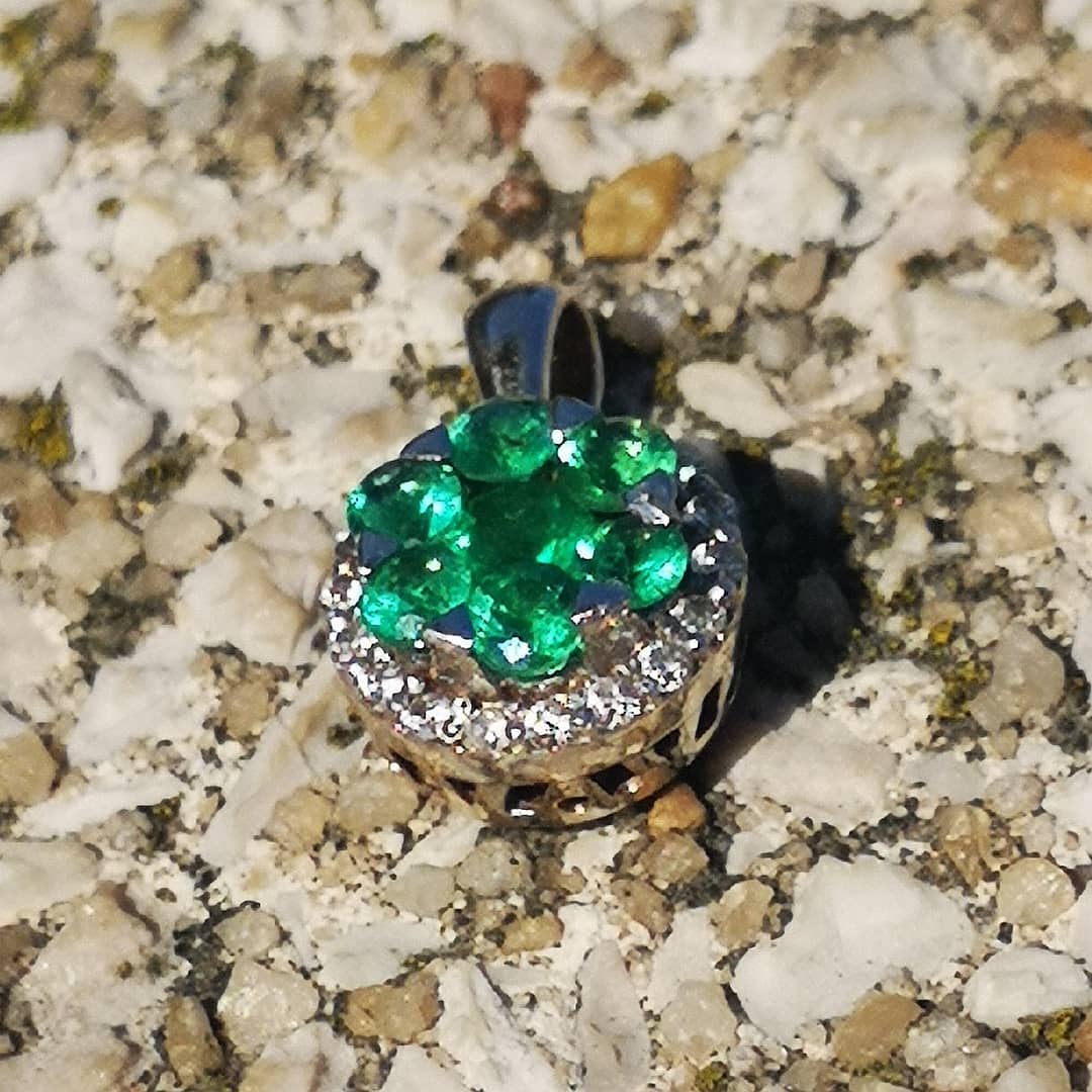 Realizada en oro de 18 quilates. Orla de esmeraldas y diamantes talla brillante. Elaboración artesanal y acabado a mano.