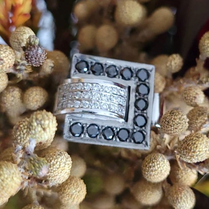 Realizada en oro de 18 quilates. Diamantes talla brillante blancos (0.18 kts.) y negros (0.83 kts.). Elaboración artesanal y acabado a mano.
