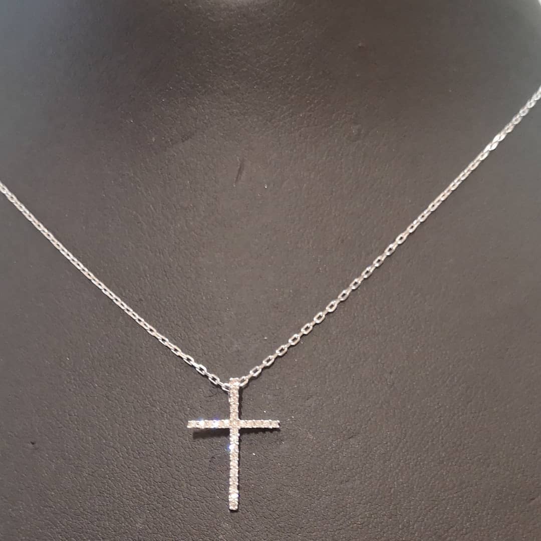 Realizada en oro de 18 quilates. Cruz con diamantes talla brillante. Cadena fina de oro blanco incluida. Elaboración artesanal y acabado a mano.