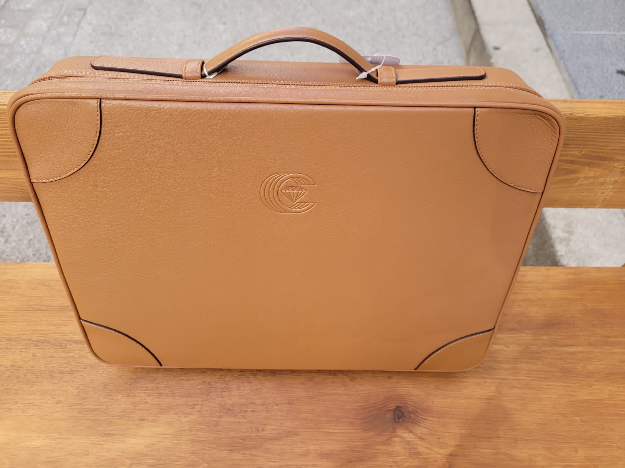 Realizado en piel natural. Color camel. Elaboración artesanal en España (Ubrique). Apertura colgante en plata de ley con diamante talla brillante, realizada y acabada a mano.