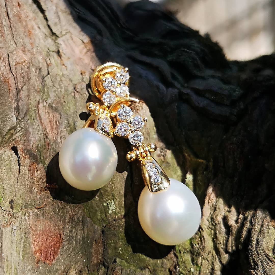 Realizados en oro de 18 quilates. Perlas australianas y diamantes talla brillante (0.90 kts.). Elaboración artesanal y acabado a mano.