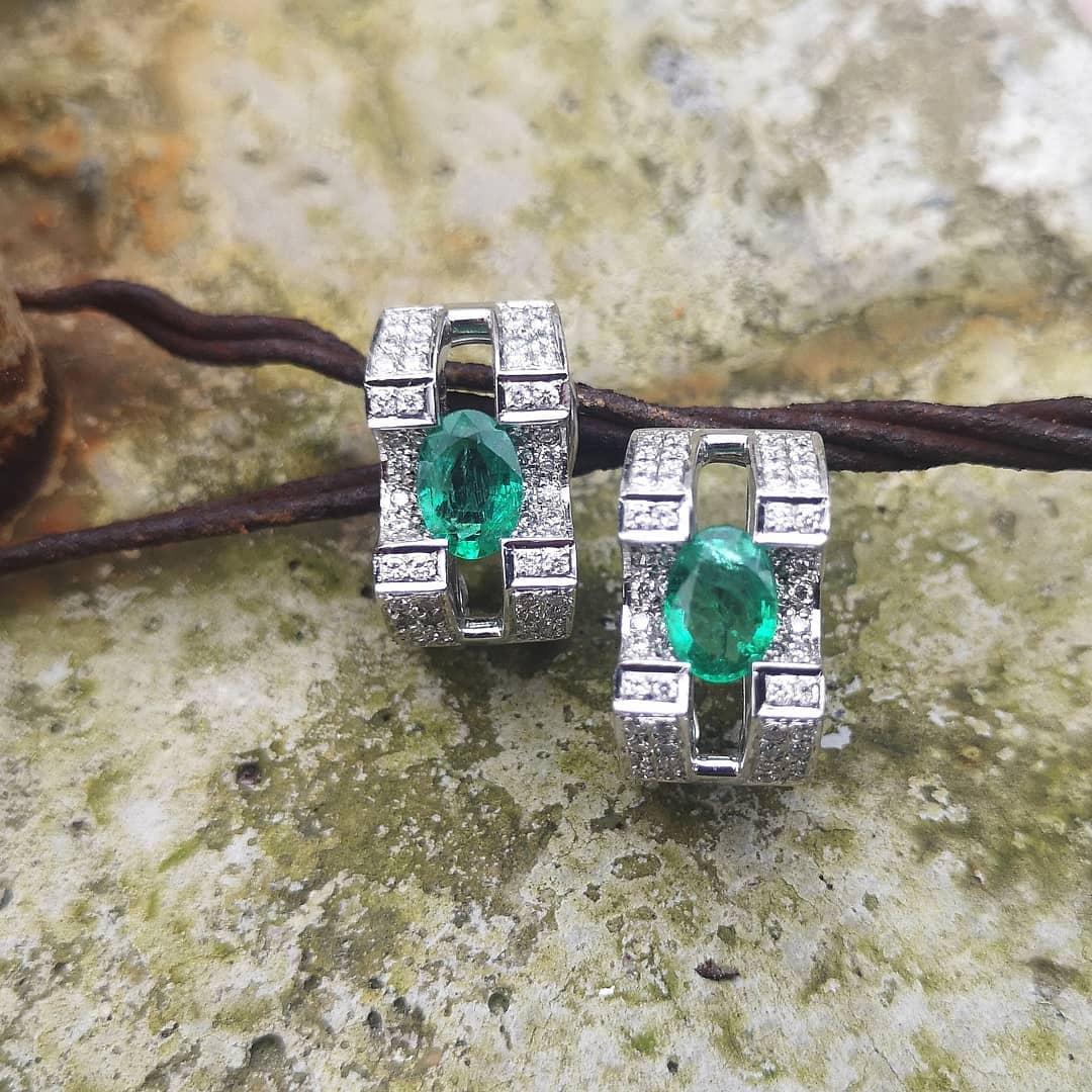 Realizados en oro de 18 quilates. Pareja de esmeraldas (1.22 kts.) y diamantes talla brillante (0.64 kts.). Elaboración artesanal y acabado a mano.