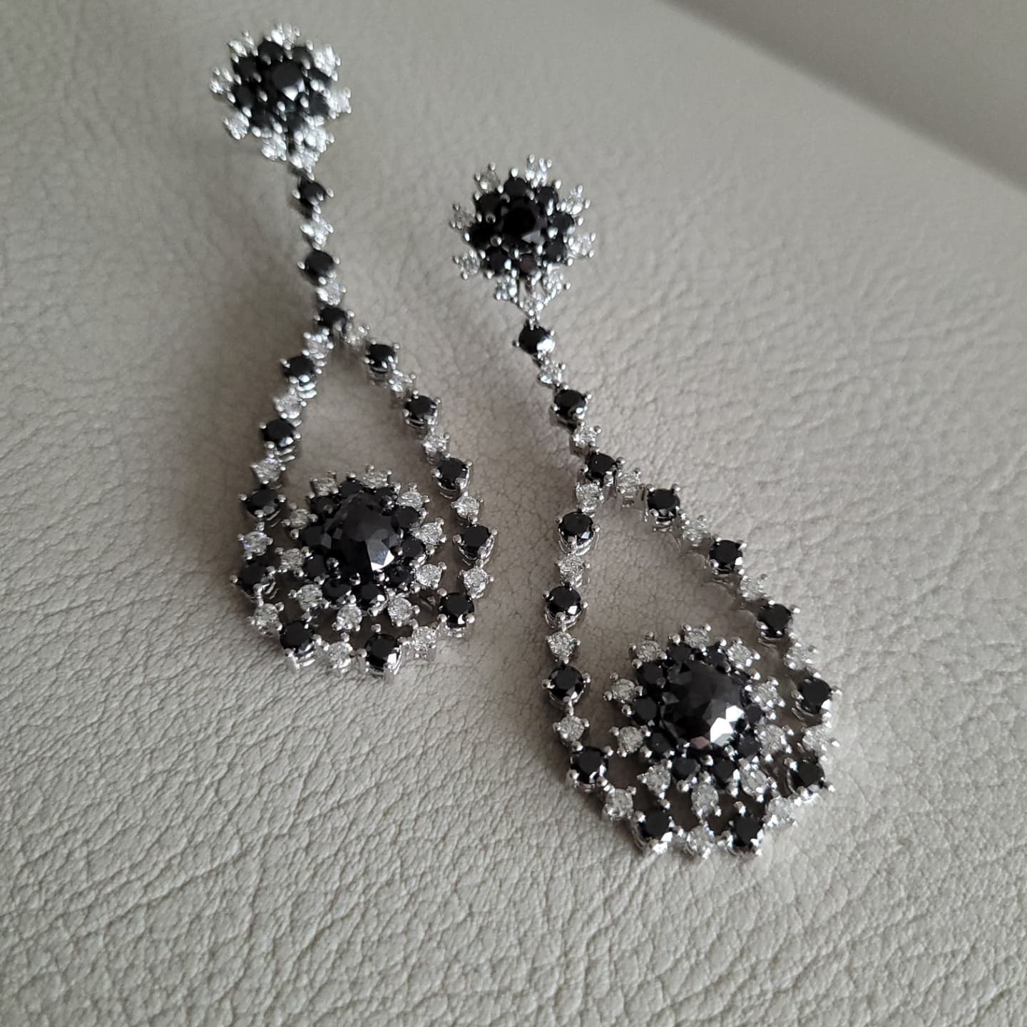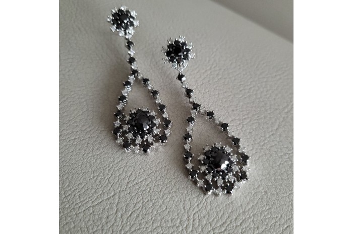 Realizados en oro de 18 quilates. Diamantes talla brillante negros (6.17 kts.) y talla brillante blancos (4.92 kts.). Elaboración artesanal y acabado a mano.