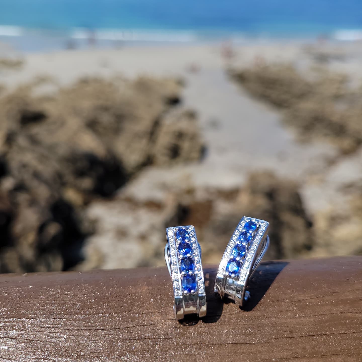 Realizados en oro de 18 quilates. Zafiros azules (1.71 kts.) y diamantes talla brillante. Cierre omega. Elaboración artesanal y acabado a mano.