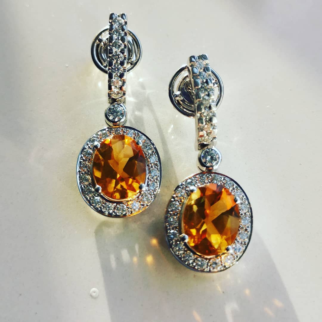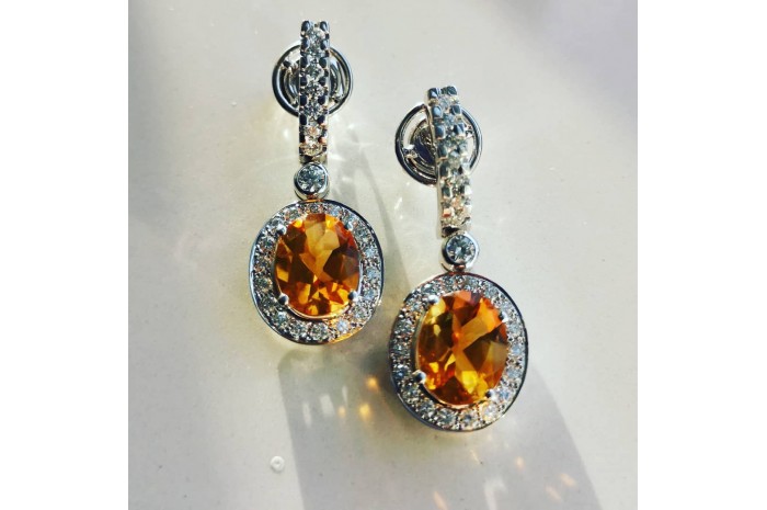 Realizados en oro de 18 quilates. Pareja de citrinos (4.38 kts.) y diamantes talla brillante (1.20 kts.). Elaboración artesanal y acabado a mano.