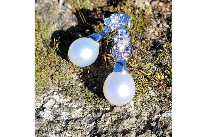 Realizados en oro de 18 quilates. Perlas australianas y diamantes talla brillante (0.40 kts.). Elaboración artesanal y acabado a mano.