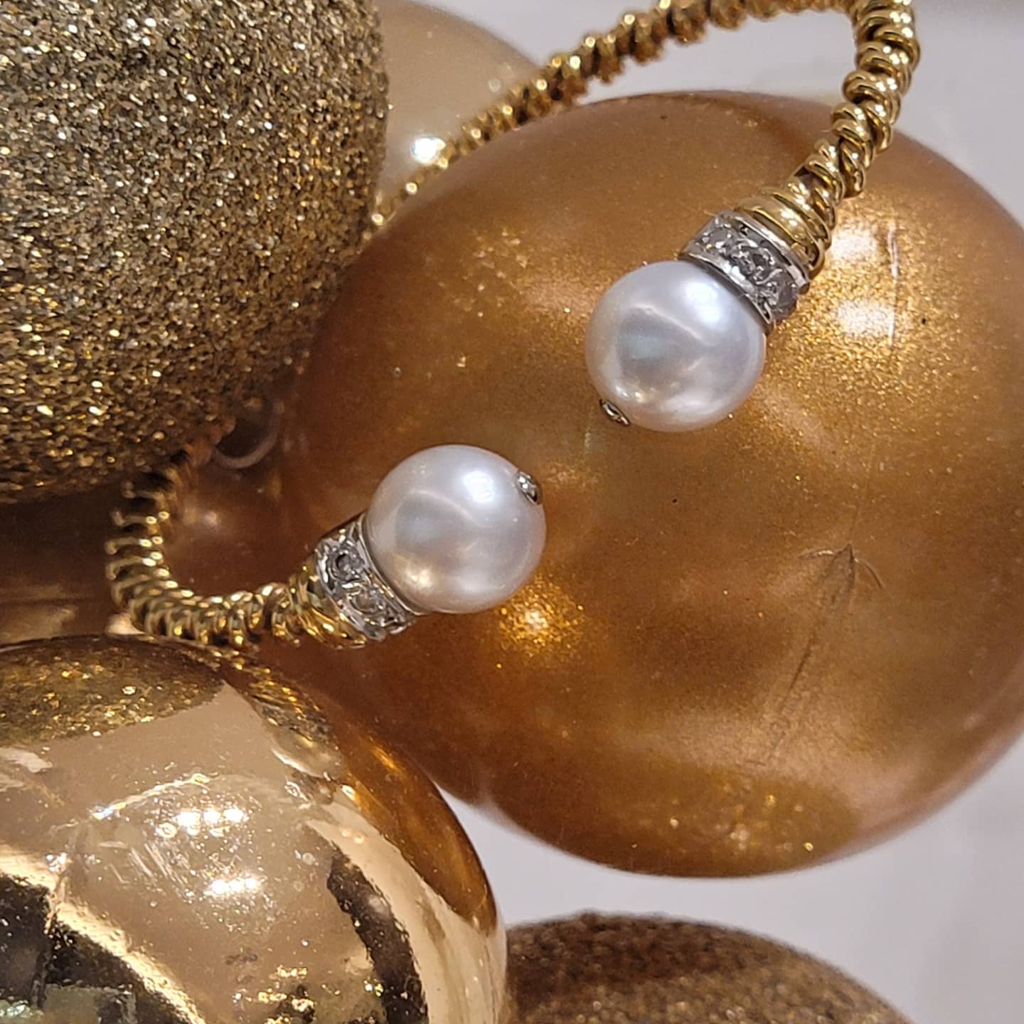 Realizada en oro de 18 quilates. Diamantes talla brillante (0.31 kts.) y perlas australianas. Elaboración artesanal y acabado a mano.