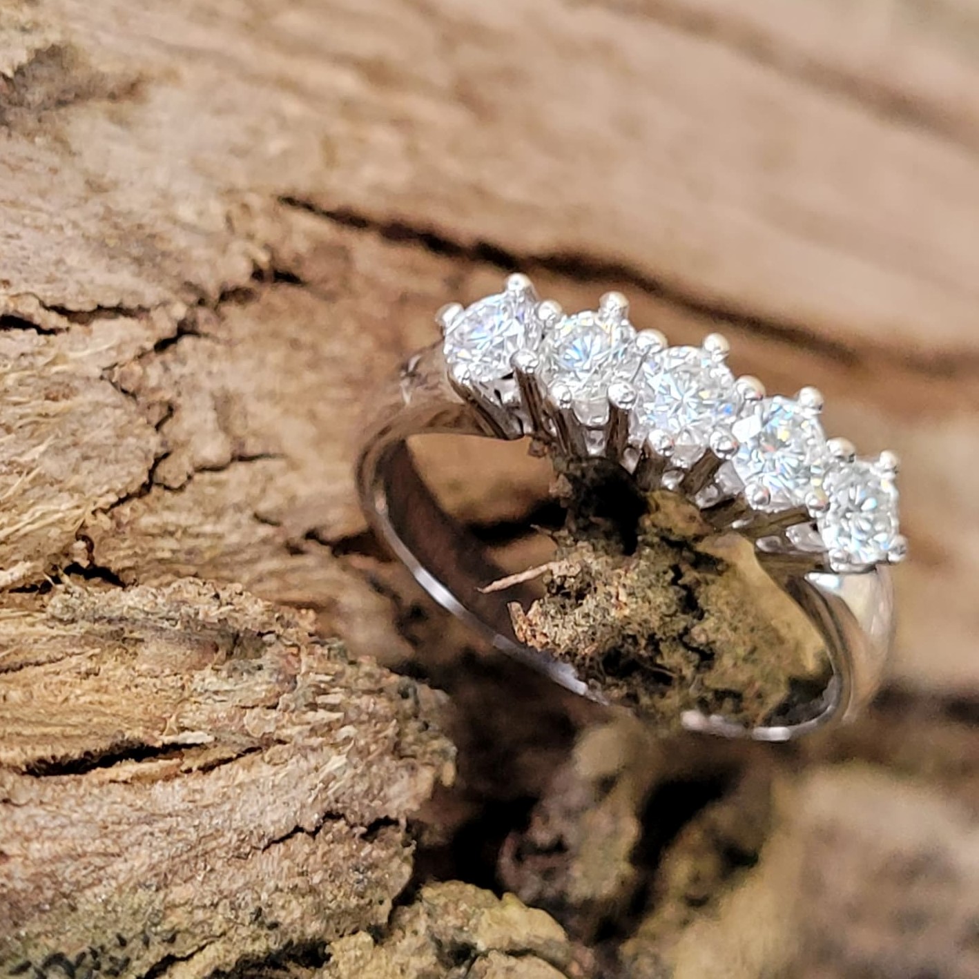 Realizada en oro de 18 quilates. 5 Diamantes talla brillante (0.75 kts.). Elaboración artesanal y acabado a mano.