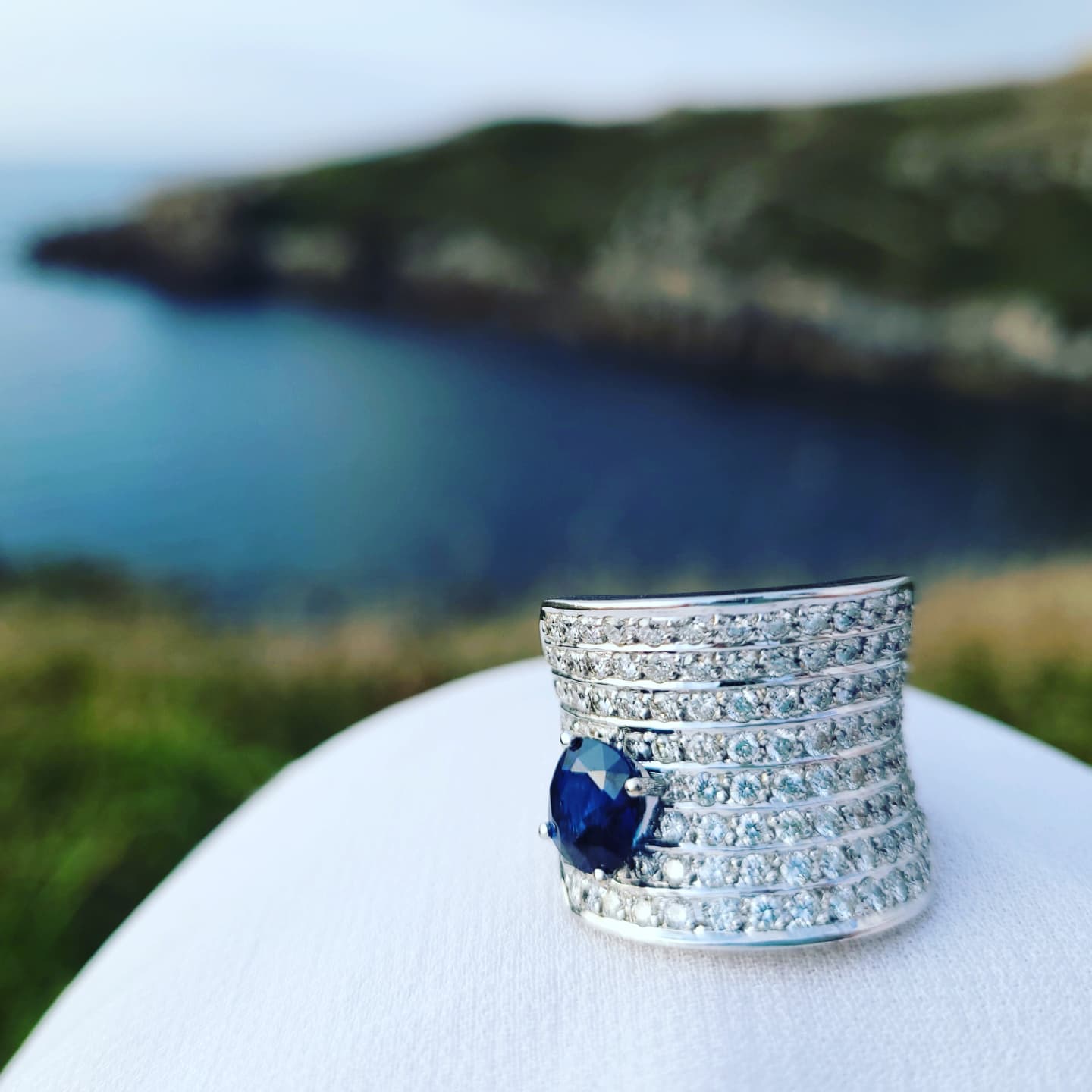 Realizada en oro de 18 quilates. Zafiro central oval (2.10 kts.) y diamantes talla brillante (2.42 kts.). Elaboración artesanal y acabado a mano.