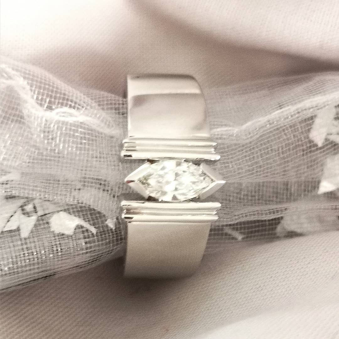 Realizada en oro de 18 quilates. Diamante talla marquise (0.39 kts.). Elaboración artesanal y acabado a mano.