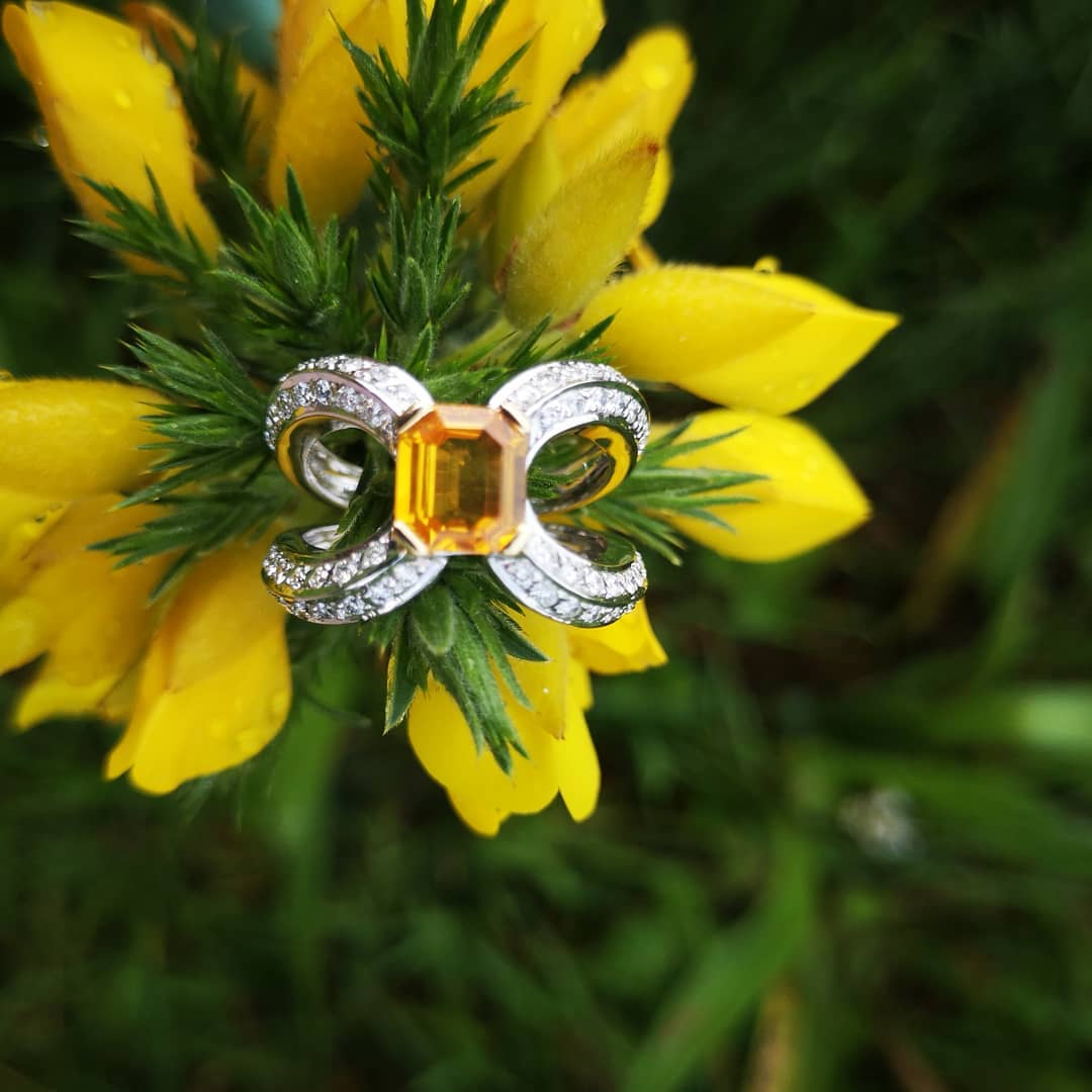 Realizada en oro de 18 quilates. Zafiro amarillo (1.59 kts.) y diamantes talla brillante (0.67 kts.). Elaboración artesanal y acabado a mano.