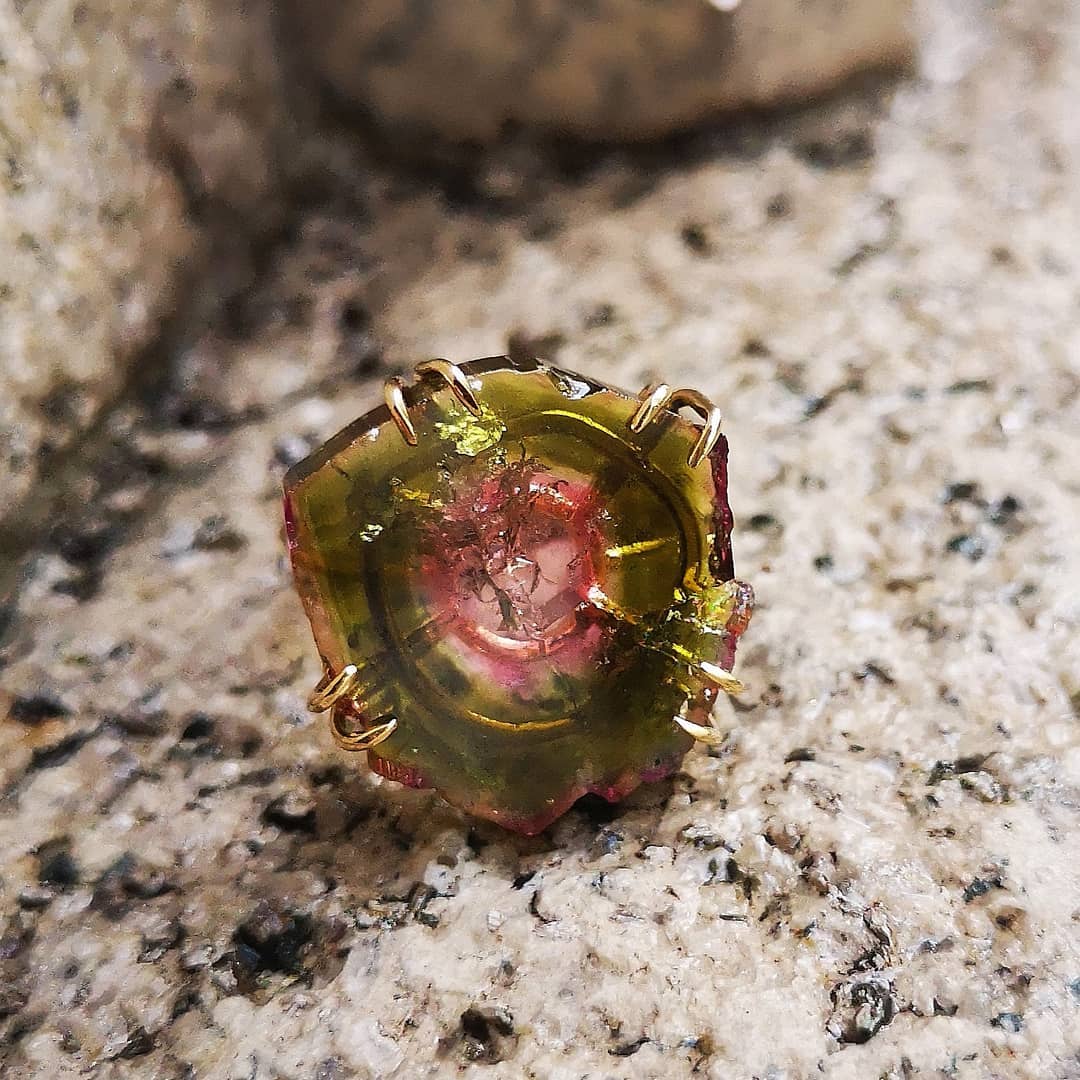 Realizada en oro amarillo de 18 quilates. Turmalina natural central. Elaboración artesanal y acabado a mano.