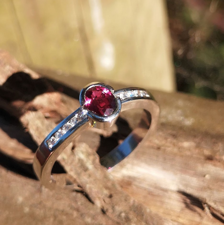 Realizada en oro de 18 quilates. Rubí y diamantes talla brillante. Elaboración artesanal y acabado a mano.
