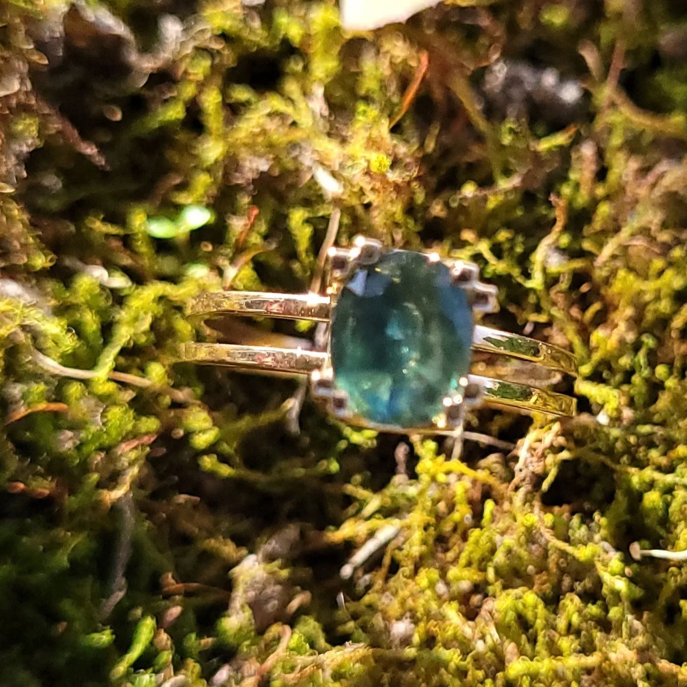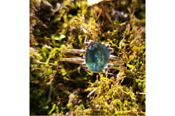 Realizada en oro de 18 quilates. Zafiro verde natural. Elaboración artesanal y acabado a mano.