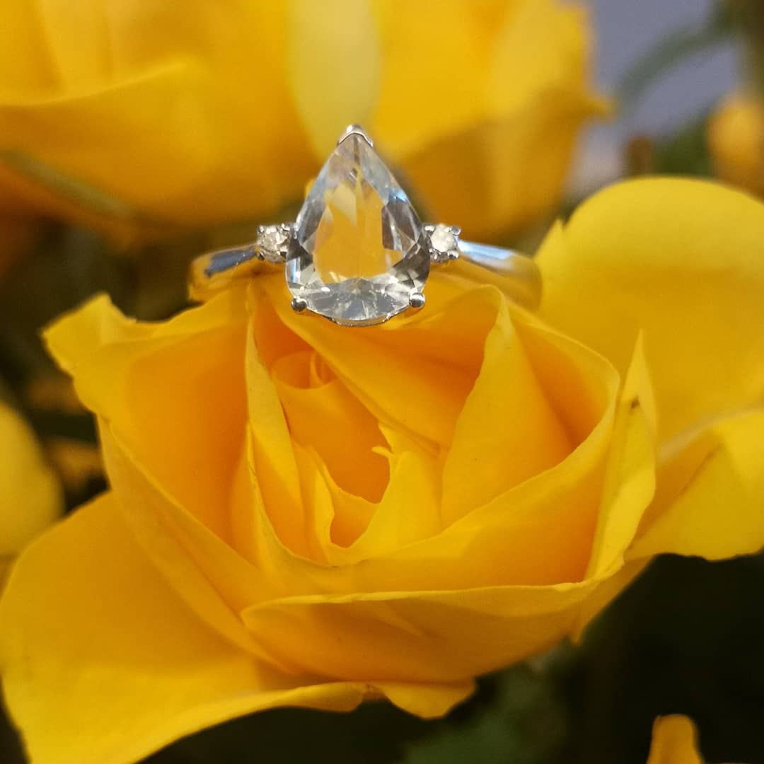 Realizada en oro blanco de 18 quilates. Aguamarina central y 2 diamantes talla brillante. Elaboración artesanal y acabado a mano.